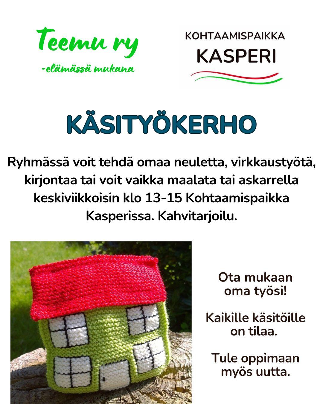 Käsityöryhmä kokoontuu keskiviikkoisin kohtaamispaikka Kasperissa klo 13-15. Tule viihtymään ja tekemään käsitöitä rennossa ilmapiirissä. Oma käsityö mukaan. Kaikki käsityöt sallitaan. Voit osallistua…