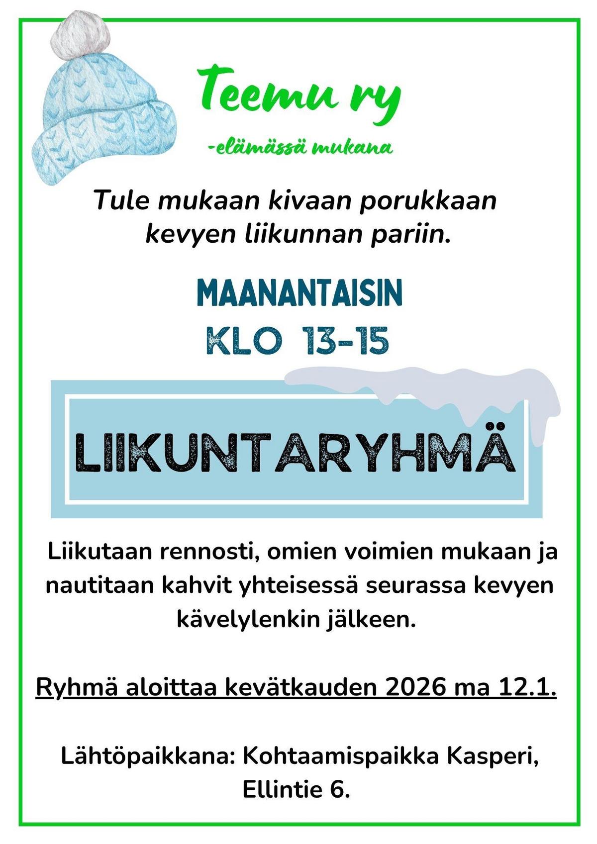 Liikuntaryhmä maanantaisin klo 13-15.